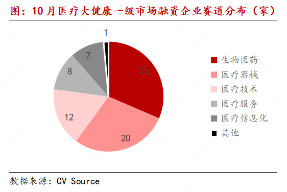 10月1日-10月31日,据CV Source统计,医疗大健康范围有70起一级阛阓投融资事件(相较于9月略有下落):生物医药融资22起(5起裸露详备金额统共为11.85亿东谈主民币,3起裸露为亿元级),医疗器械融资20起(1起裸露详备金额1.28亿东谈主民币,1起裸露为亿元级),医疗时间融资12起(1起裸露为亿元级,1起裸露为数千万元),医疗信息化7起(1起裸露为2794万元,1起裸露为亿元级),医疗作事8起(1起裸露为3000万好意思元,1起裸露为数亿元),其他范围1起(未裸露金额)。