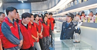 王妙丽(右一)在河南省第二强制闭幕戒毒所禁毒扶植基地为前来参不雅的学生作禁毒宣讲。 府上图片
